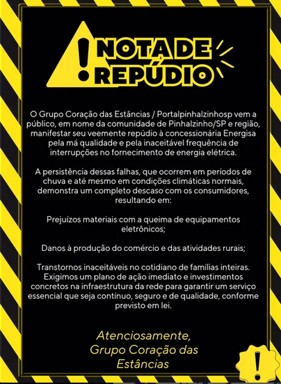 Pinhalzinho/SP e Região – O Grupo Coração das Estâncias, em conjunto com o Portalpinhalzinhosp, publicou uma veemente Nota de Repúdio direcionada à concessionária Energisa, expressando profunda insatisfação com a qualidade e a inaceitável frequência das interrupções no fornecimento de energia elétrica na comunidade de Pinhalzinho/SP e região.